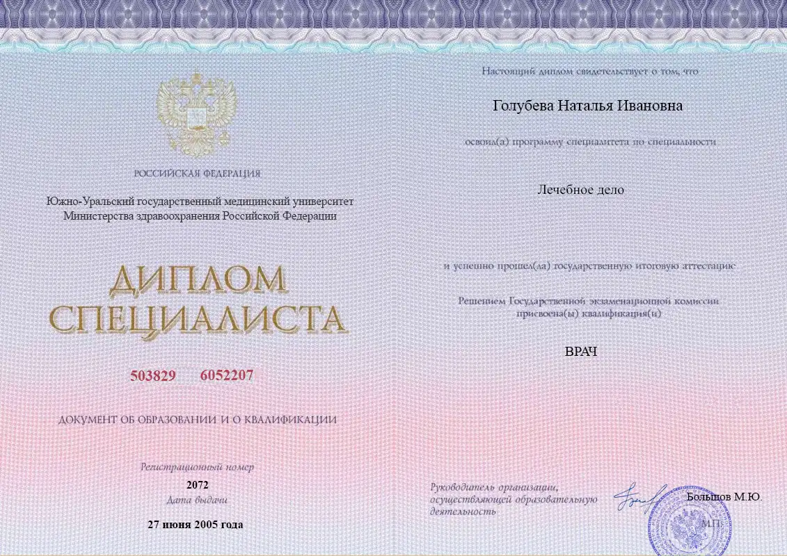 В 2005 году получила диплом по специальности «Лечебное дело» в Южно-Уральском государственном медицинском университете. В 2007 и 2011 году закончила ординатуру и курсы повышения квалификации по анестезиологии и реаниматологии.